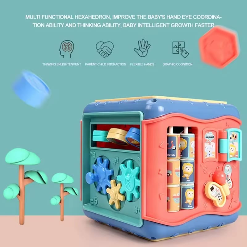 - A 6-sided baby activity cube designed for early learning and sensory development.