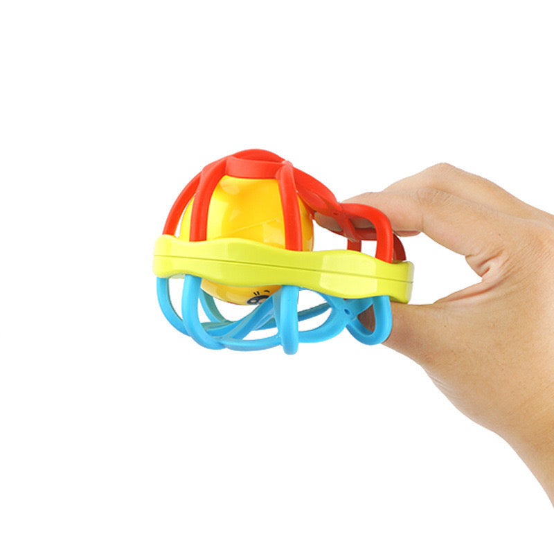 • Outer Cage: Features a flexible, open framework made of multiple brightly colored interlocking plastic bands (red, yellow-green, and blue). This design makes the toy easy for babies to grab, shake, and manipulate, promoting fine motor skills.