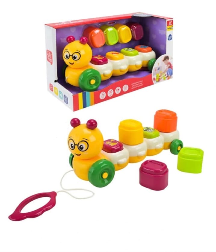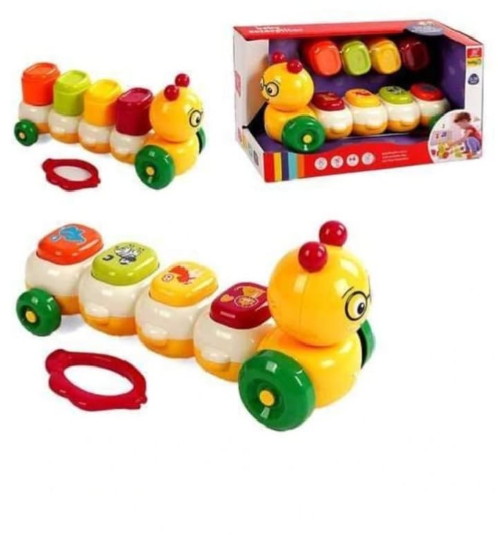 - Each segment has a colored button/top with a picture of an animal or shape.